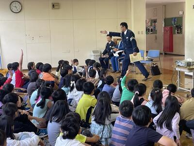 10月9日(水)、函館方面本部交通課様のご協力により、低学年の交通安全教室を行いました。「信号機のない横断歩道を渡るときは、歩行者が渡ることを運転者にアピールし、運転者が止まってから、渡りましょう」「お互い挨拶ができると素敵です」という内容で、お話やクイズや動画を交えて教えていただき、最後にはパトカーや白バイを間近で見ることができました。子どもたちが日常生活の中で実践できるようご指導いただき、ありがとうございました。