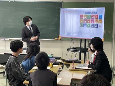 12月21日(木)北海道教育大学教育学部 函館校国際地域学科 地域教育3年生の学生(6名)によるSDGsについて考える学習を行いました。「つながる」をテーマにして、世界プロジェクトが自分たちの生活ともつながっていることを学びました。節電やゴミ分別など自分たちにもすぐにできることがたくさんあることに気付くことができました。学生の皆さん、ありがとうございました。